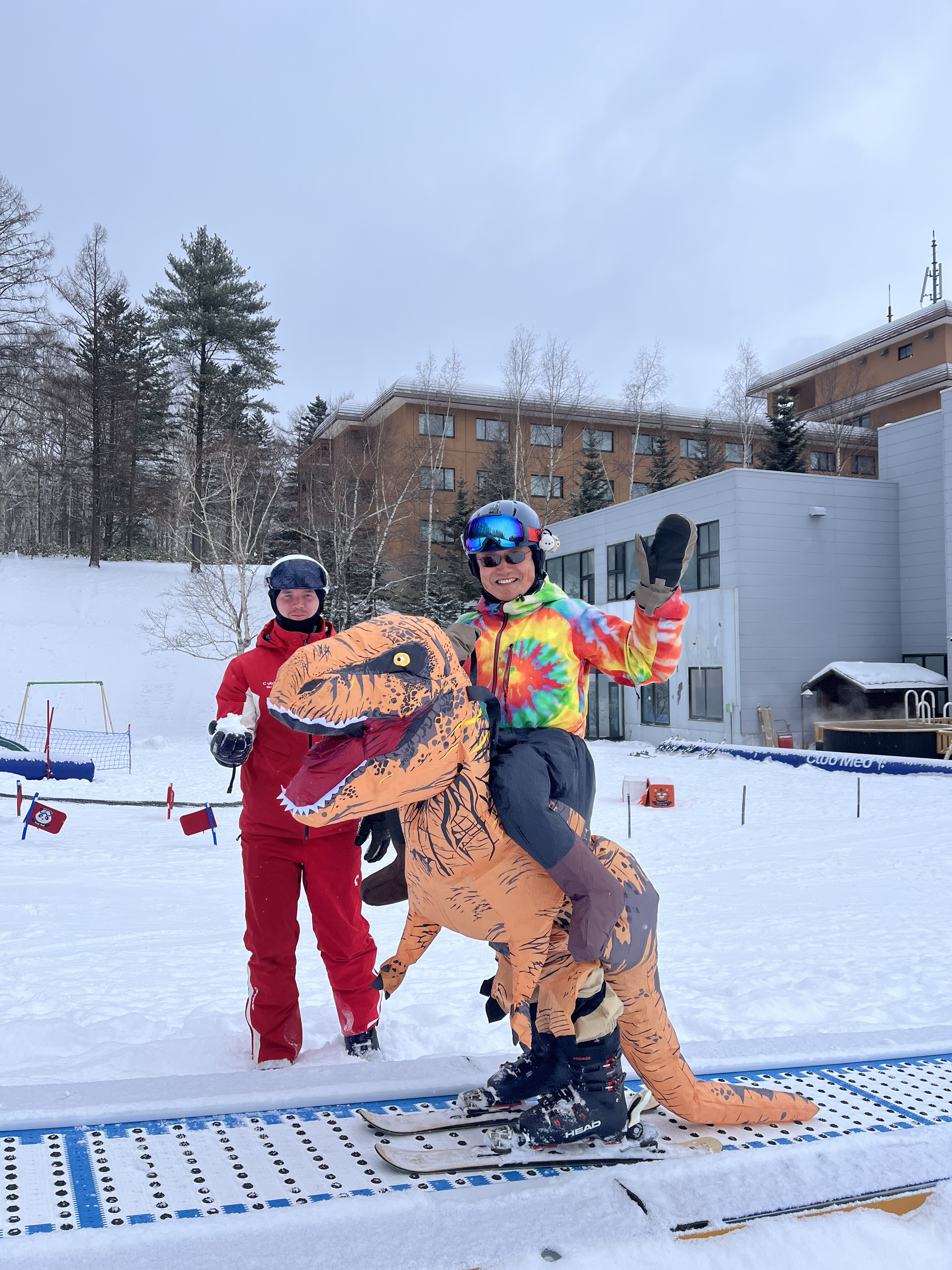 午後は持参した恐竜の着ぐるみで滑走。最初はショートスキーで小一時間滑り、あとはボードに履き替えた。