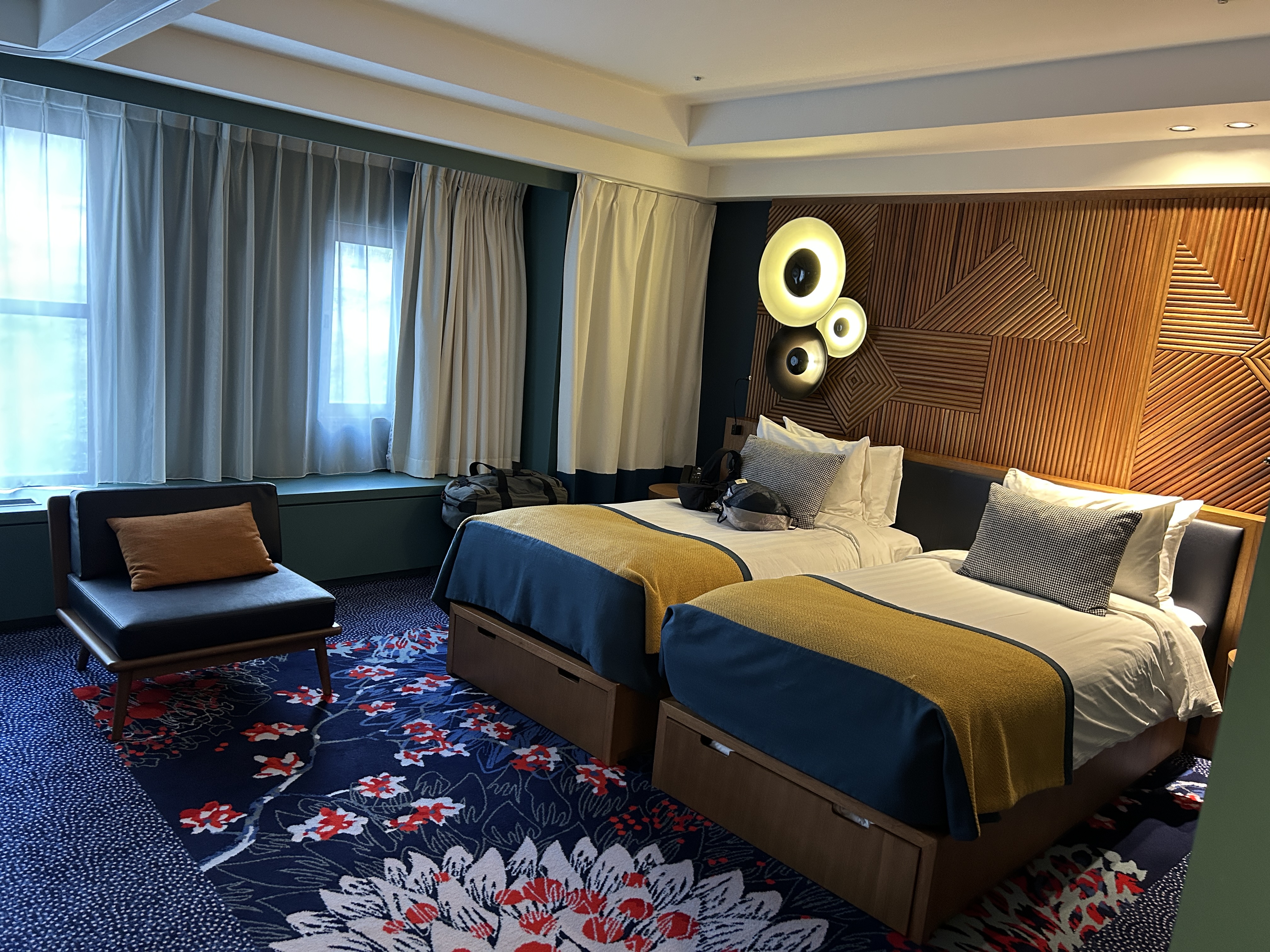 広くてきれいな部屋だ。ゲストと同じようにブレスレット型のキーをつけてもらう。贅沢してる気分になれて単純にうれしい。
