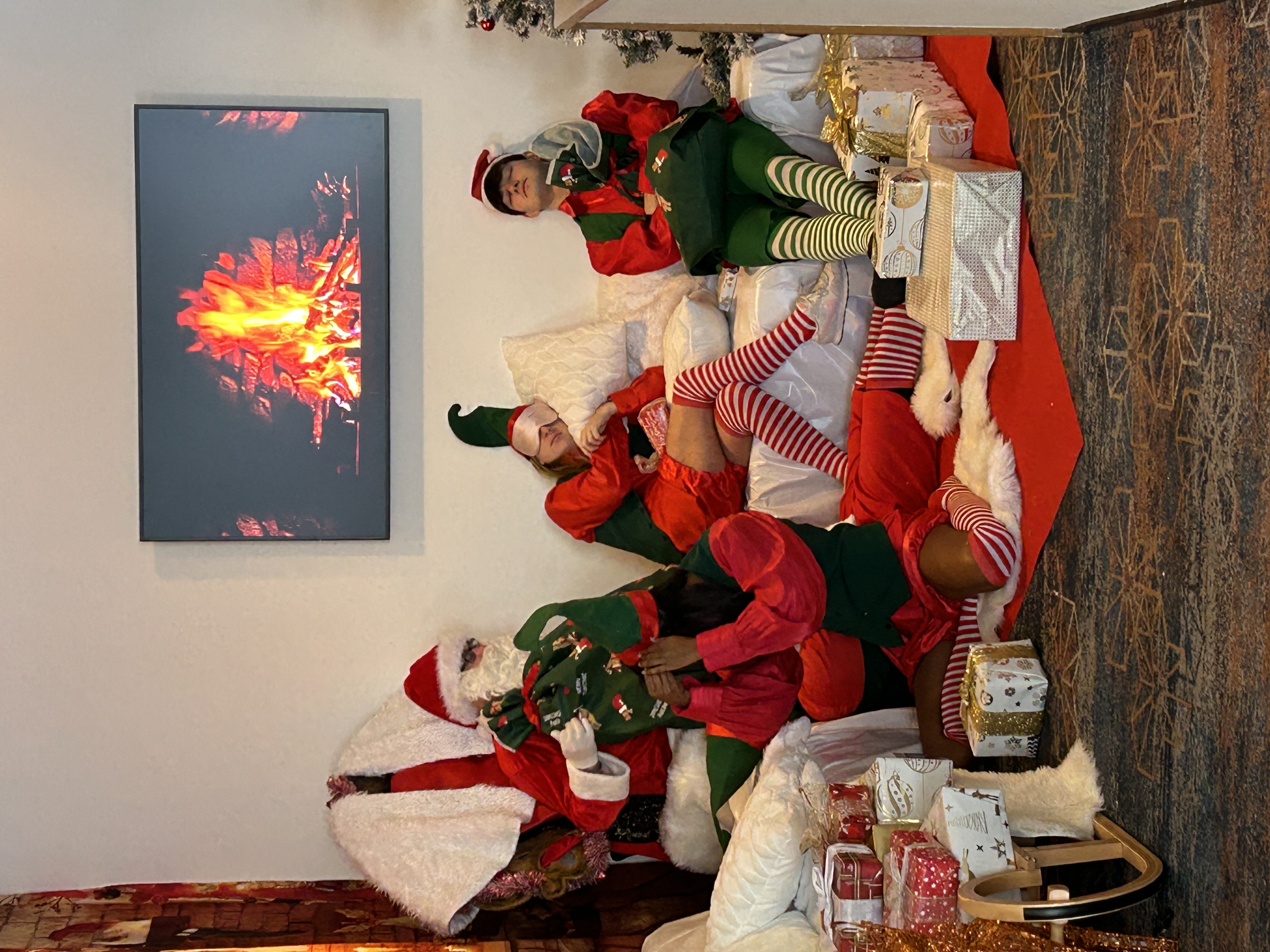 朝食時にレストランの入り口でサンタと若者たちがリビングで寝ている姿の演出をしていた。欧米か?
