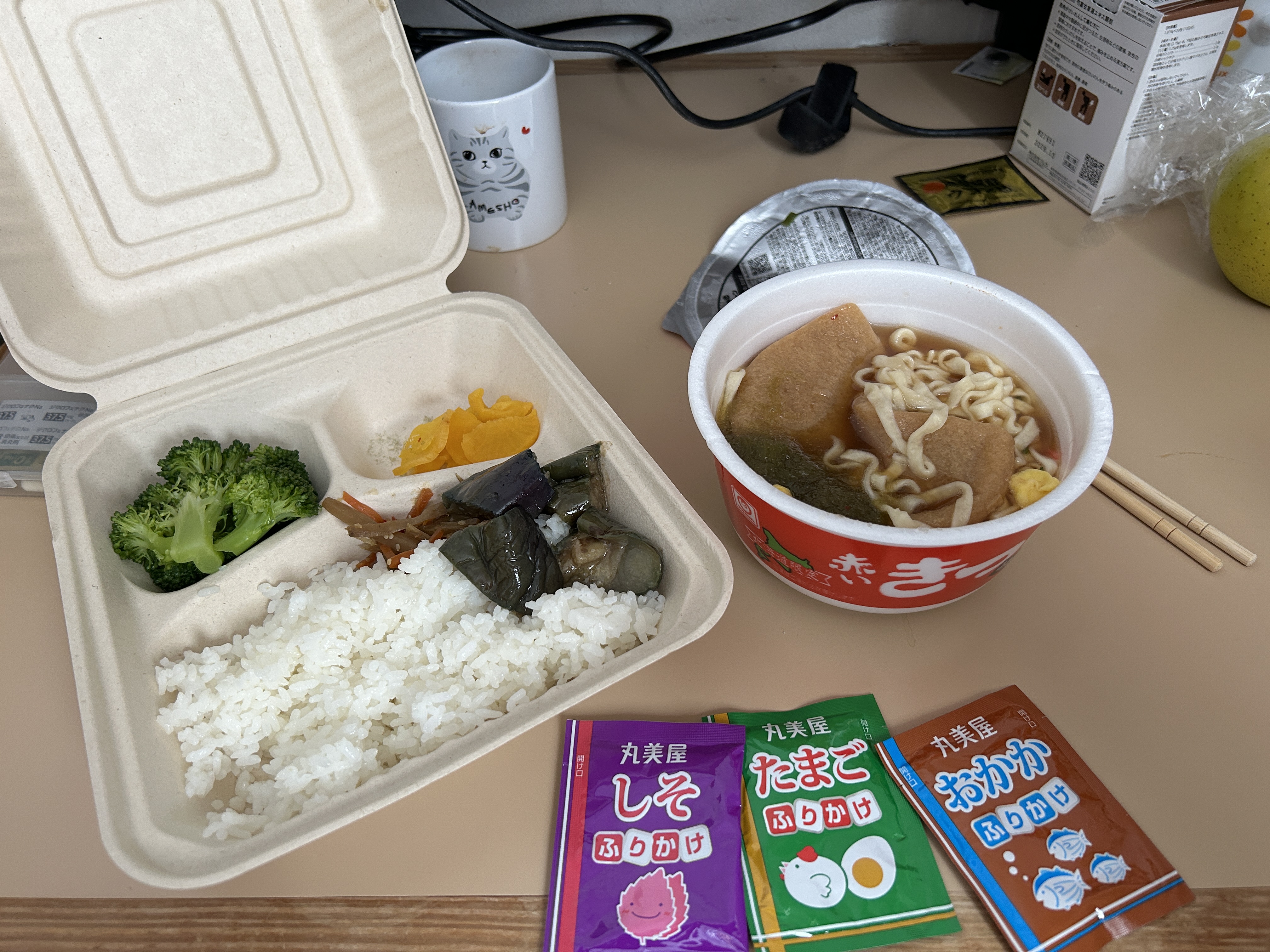 ごはんとふりかけ。これに昨日買っておいたまるちゃん赤いきつねを作って、吐かないかとおそるおそる食べる。