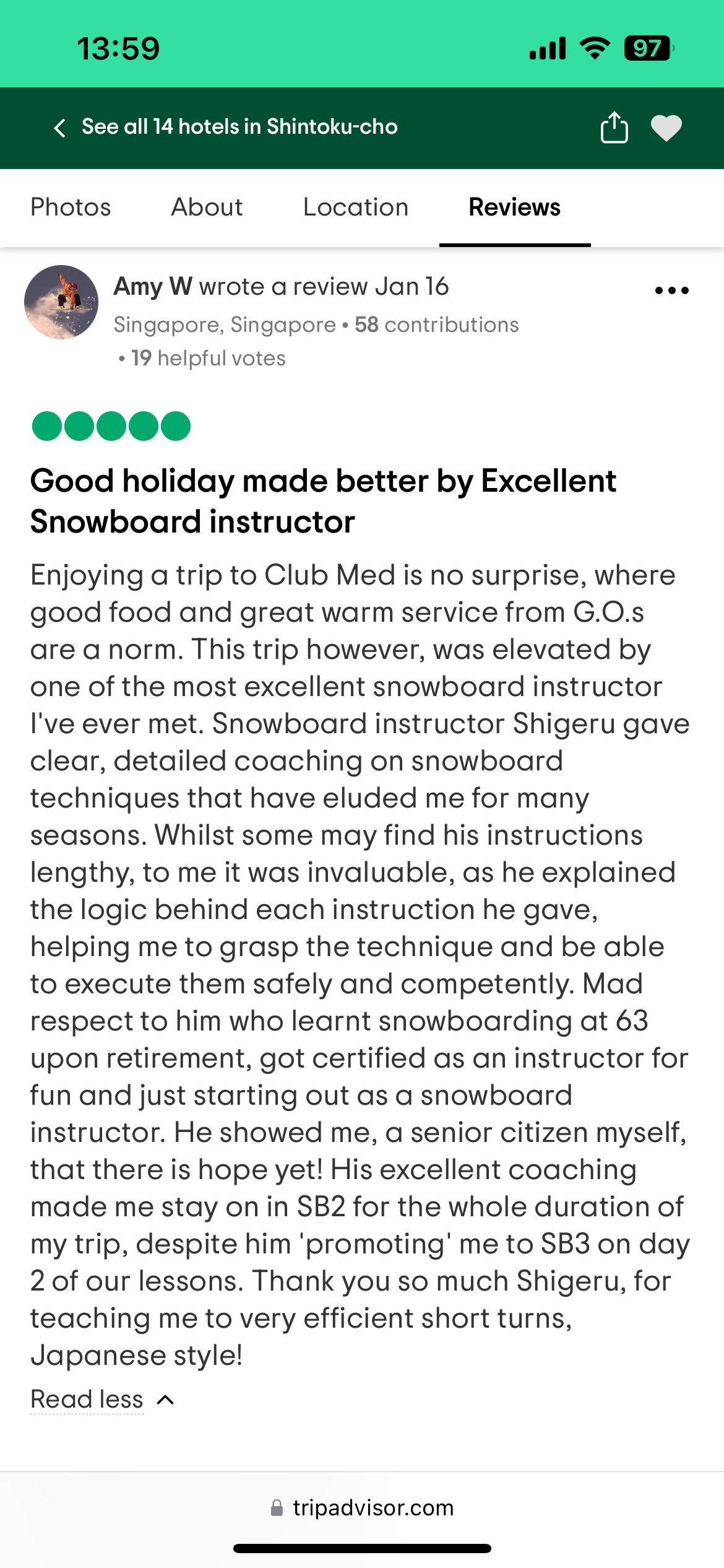 シンガポールのイーさんがトリップアドバイザーにレビューを書いてくれた。